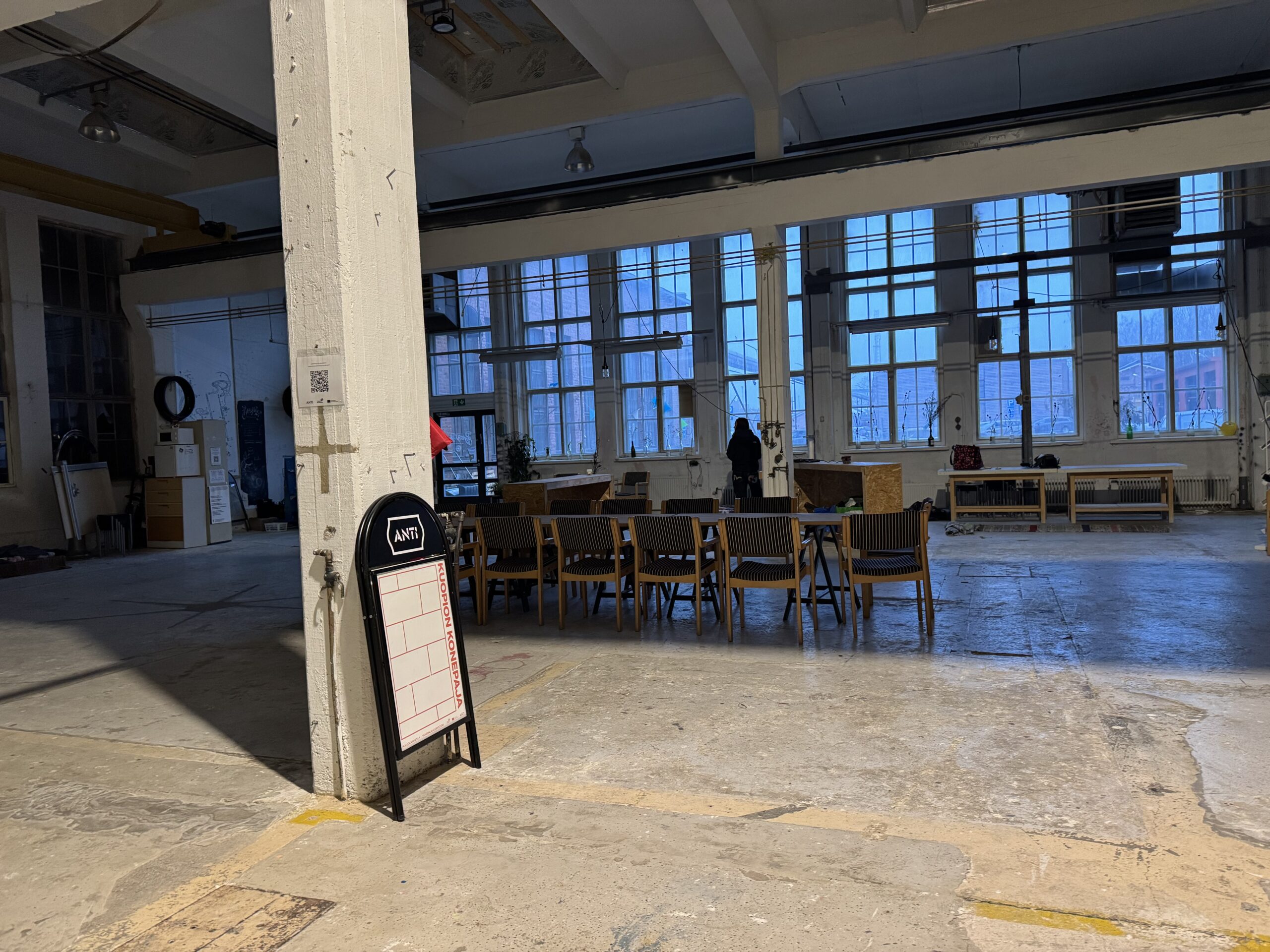 Kirjakantti-viikon aikana Kirsi-Marja Moberg työskentelee VR-konepajahallissa, jonne rakentuu taidenäyttely.