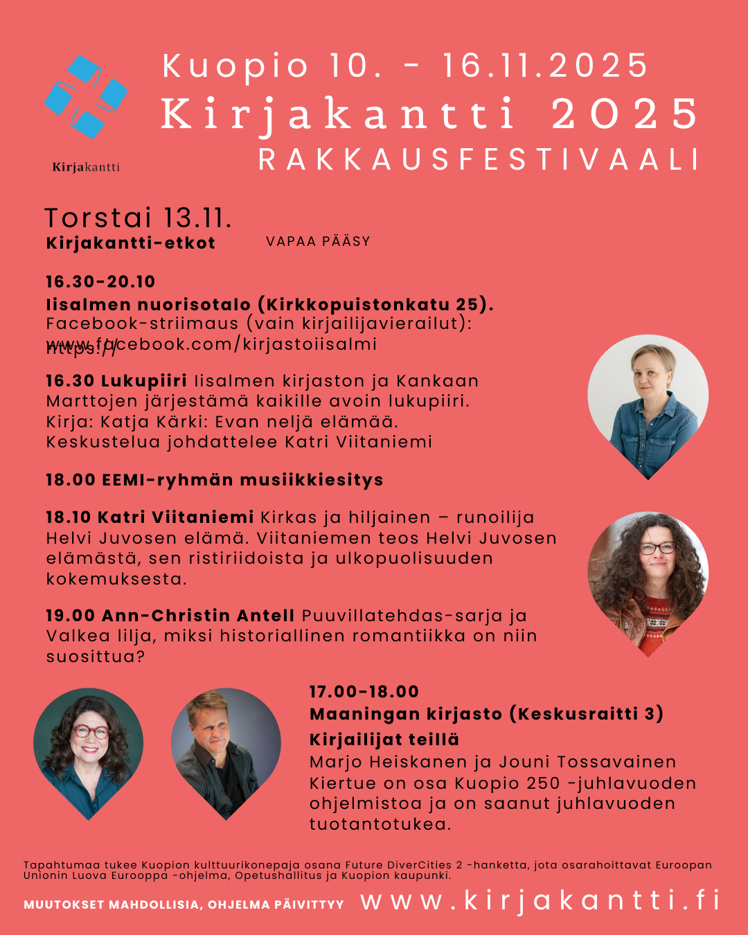 Kirjakantti-kirjallisuusfestivaaliin pääsee taas osallistumaan myös Iisalmessa! Kirjakantti-ilta järjestetään nuorisotalolla to 13.11. Ohjelmassa on kaikille avoin lukupiiri sekä Katri Viitaniemen ja Ann-Christin Antellin kirjailijavierailut. Lisäksi tilausuudessa kuullaan EEMI-ryhmän musiikkiesitys.
