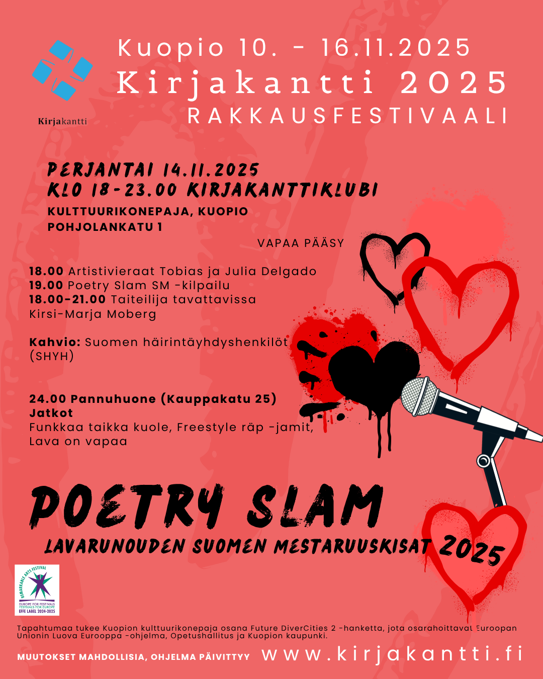 klo 19.00 (Kulttuurikonepaja) Poetry Slam SM-loppukilpailu jossa voitosta kilpailevat: