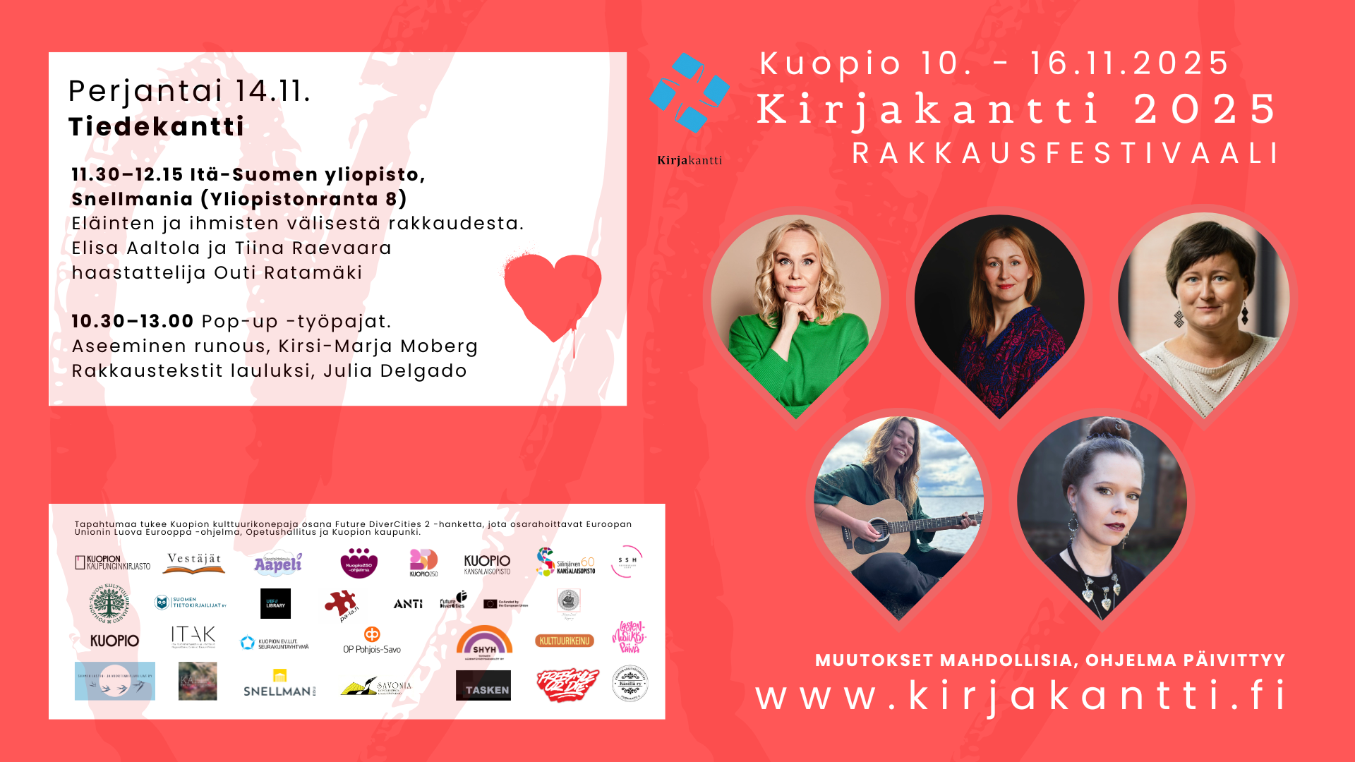 klo 11.30–12.15 Tiedekantti (Yliopisto) Eläinten ja ihmisten välisestä rakkaudesta. Vieraina tutkija-kirjailijat Elisa Aaltola ja Tiina Raevaara, joita haastattelee eläinpolitiikan dosentti, vanhempi yliopistonlehtori Outi Ratamäki