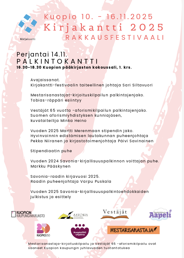klo 16.30–18.00 Palkintokantti (Pääkirjasto) Palkintokantissa julkistetaan Vestäjät 65 -aforismi-kilpailun voittaja, Sanataidekoulu Aapelin Mestarisanastajakilpailun voittajat, Martti Merenmaan stipendin saaja ja lopuksi Savonia-kirjallisuuspalkintoehdokkaat