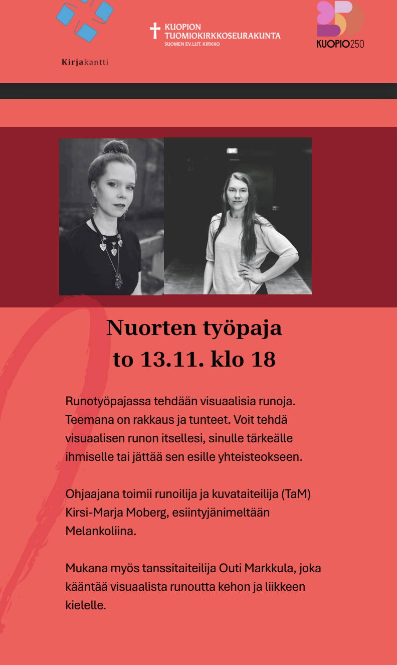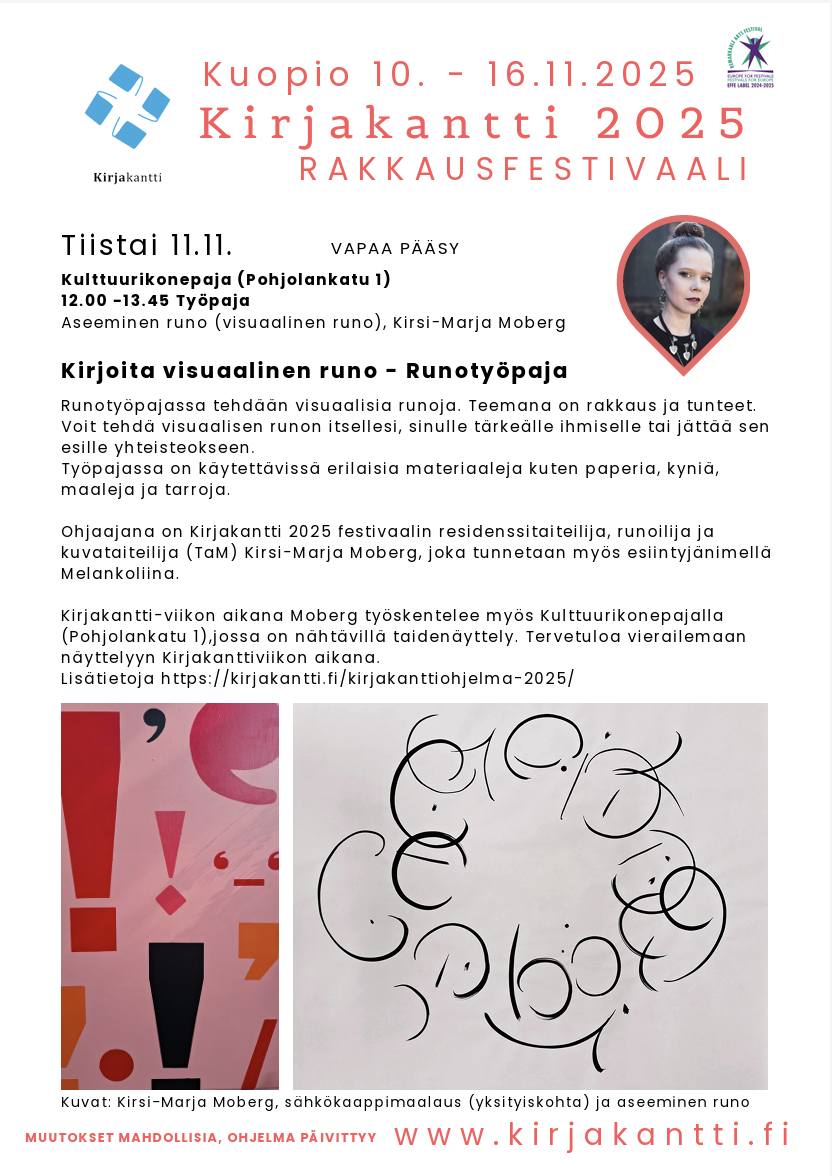 Ohjaajana on Kirjakantti 2025 festivaalin residenssitaiteilija, runoilija ja kuvataiteilija (TaM)Kirsi-Marja Moberg, joka tunnetaan myös esiintyjänimellä Melankoliina.