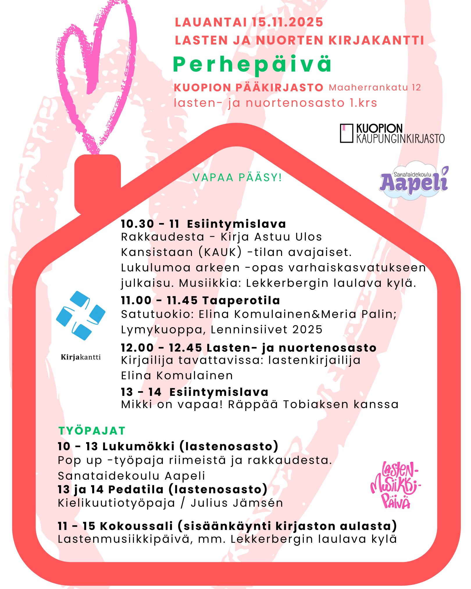 klo 10.30 Rakkaudesta. Kirja Astuu Ulos Kansistaan (KAUK) tilan avajaiset. Musiikkivieraana Lekkerbergin laulava kylä. Lukulumoa arkeen -opas varhaiskasvatukseen julkaisu